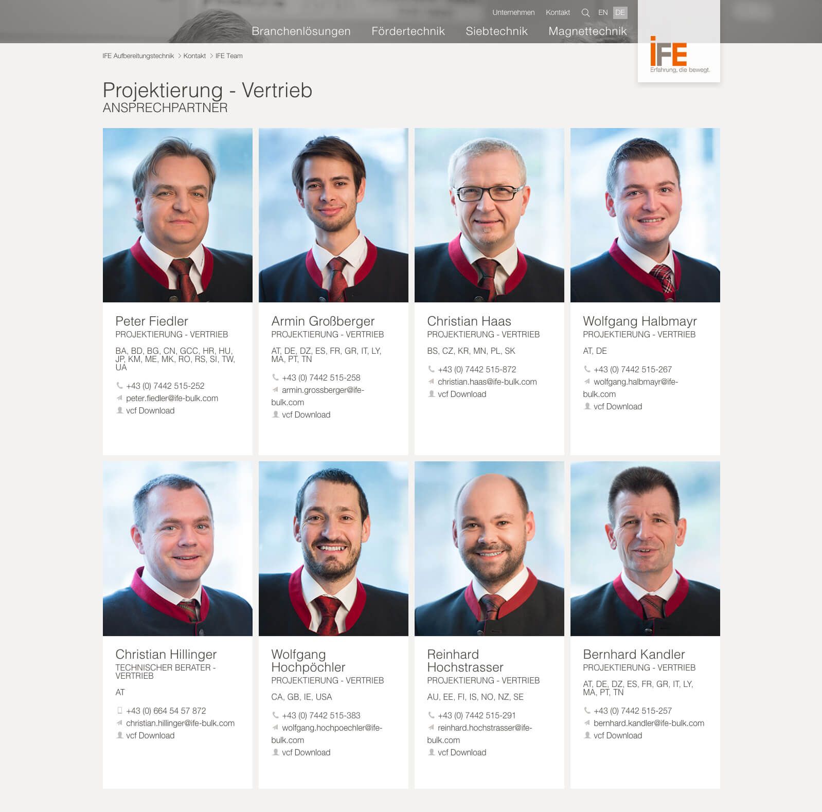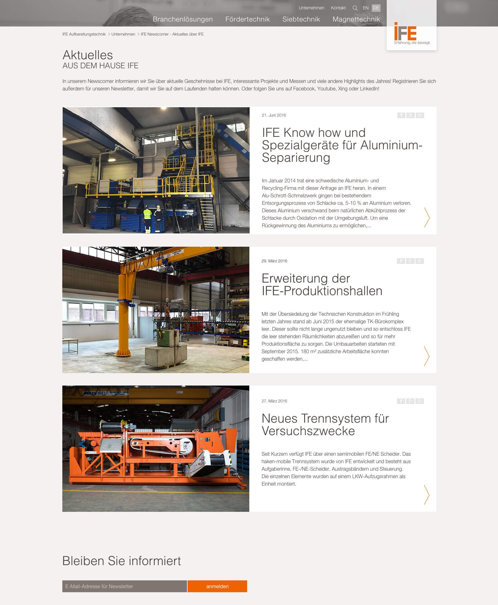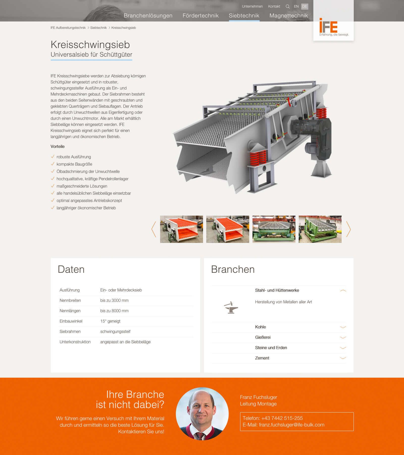 IFE ist Qualitätshersteller von Siebmaschinen, Fördergeräten und Magnetseparatoren. Mit der neuen Website werden die High-Tech Maschinen umfangreich und detailliert präsentiert. Für eine übersichtliche Navigation sorgt ein Megamenü welches die einzelnen Maschinen aus den 3 Bereichen mit einem Vorschaufoto listet.