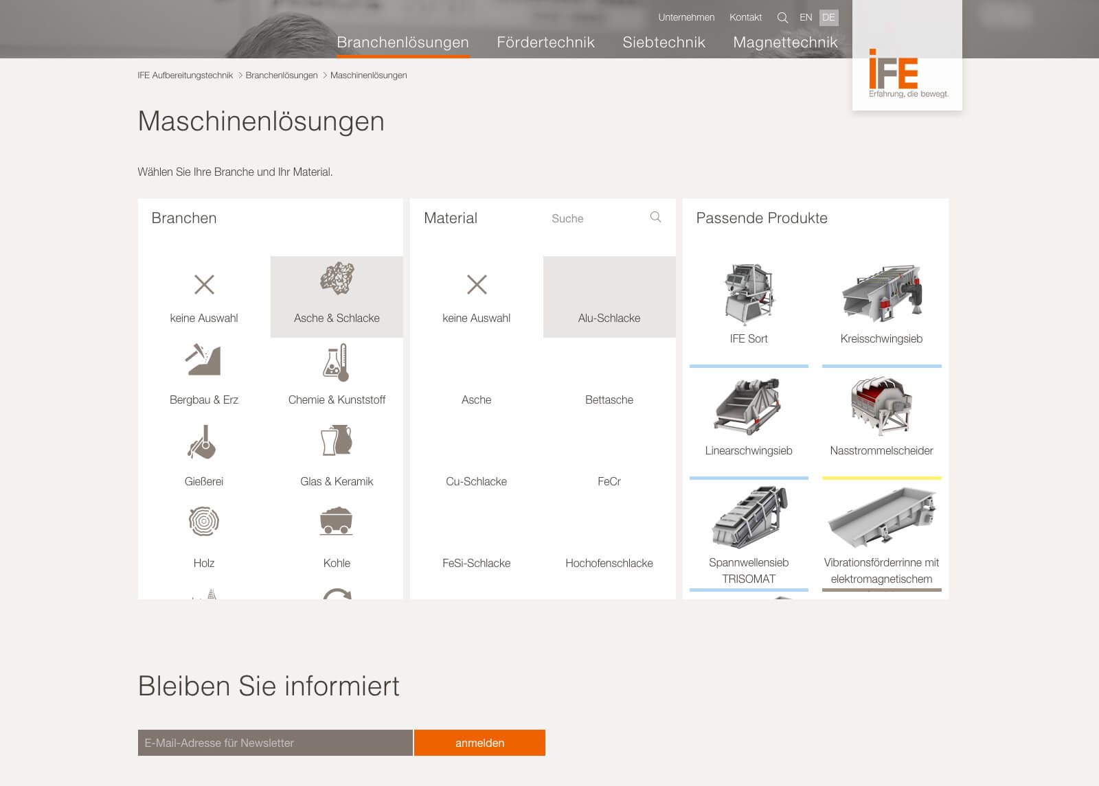 - Maschinenlösungsfinder: Anhand von Branche & Material werden die passenden Produkte dargestellt